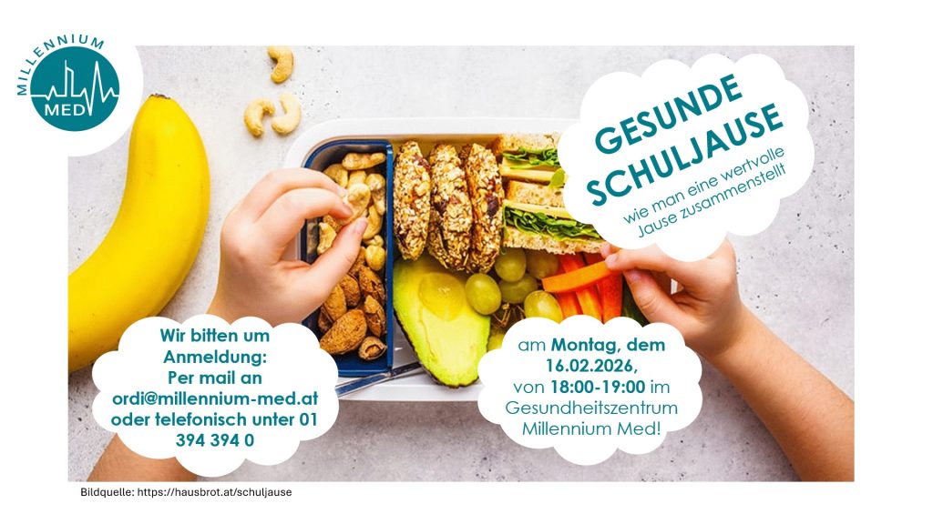 Wollen Sie wissen, wie man eine wertvolle Schuljause zusammenstellt? kommen sie zu unserem Vortrag am Montag, 16.02.2026 von 18:00-19:00 im Gesundheitszentrum Millennium Med! Wir freuen uns über zahlreiche Anmeldungen: persönlich am Empfang per mail an ordi@millennium-med.at telefonisch unter 01 394 394 0