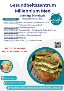 Wir freuen uns, die Vorträge unserer Diätologin Marlen Hofleitner, Bsc., für das erste Halbjahr 2026 anzukündigen. Anmeldung unter: +43 1 394 394 0 oder ordi@millennium-med.at Wir freuen uns über viele Anmeldungen!